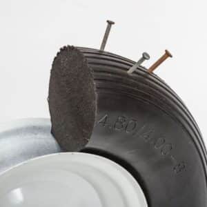 These wheels are actually the most durable of the ones listed because they do not use air or foam in the middle. The smooth travel and less maintenance needed, allow these tires to be cost-effective for backyard work.